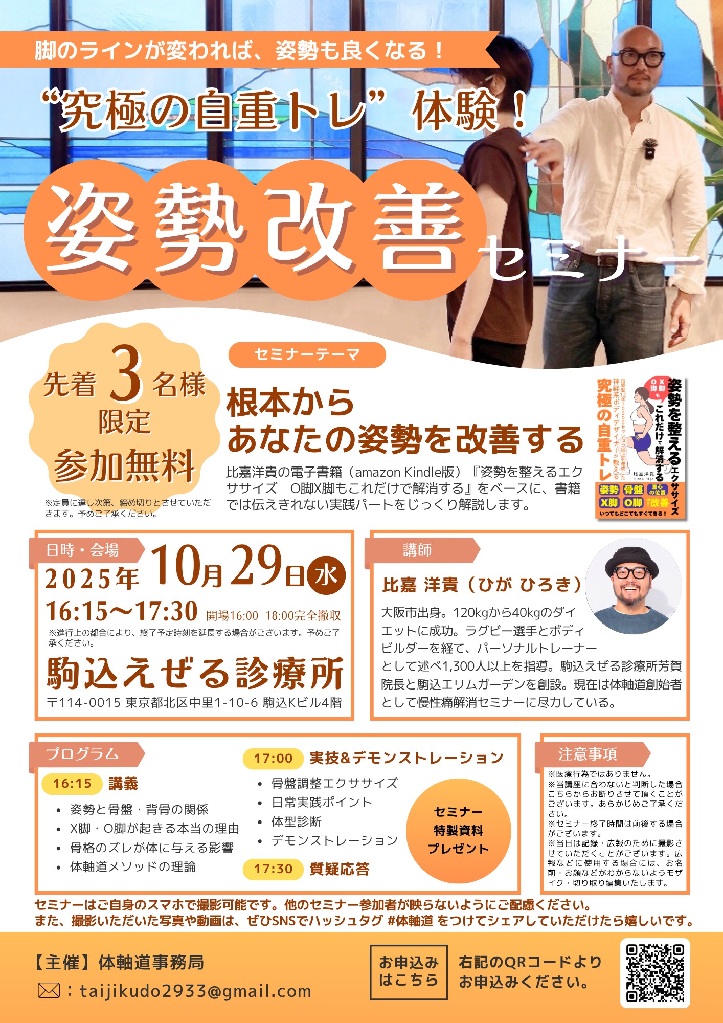 - 【10月29日】「姿勢改善セミナー(体軸道事務局主催)」が開かれます。
