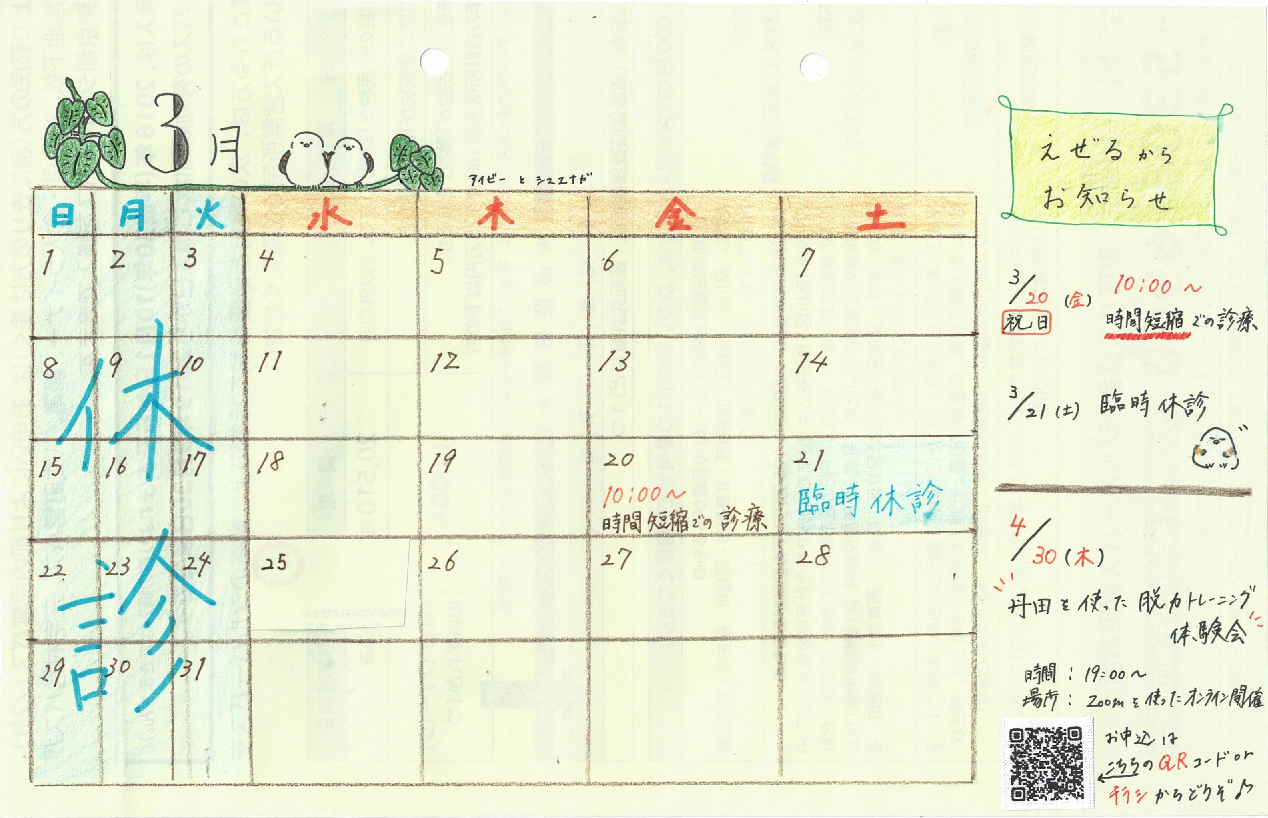 - 3月の予定表(行事は「患者様対象」「事前申込制」)を更新しました。