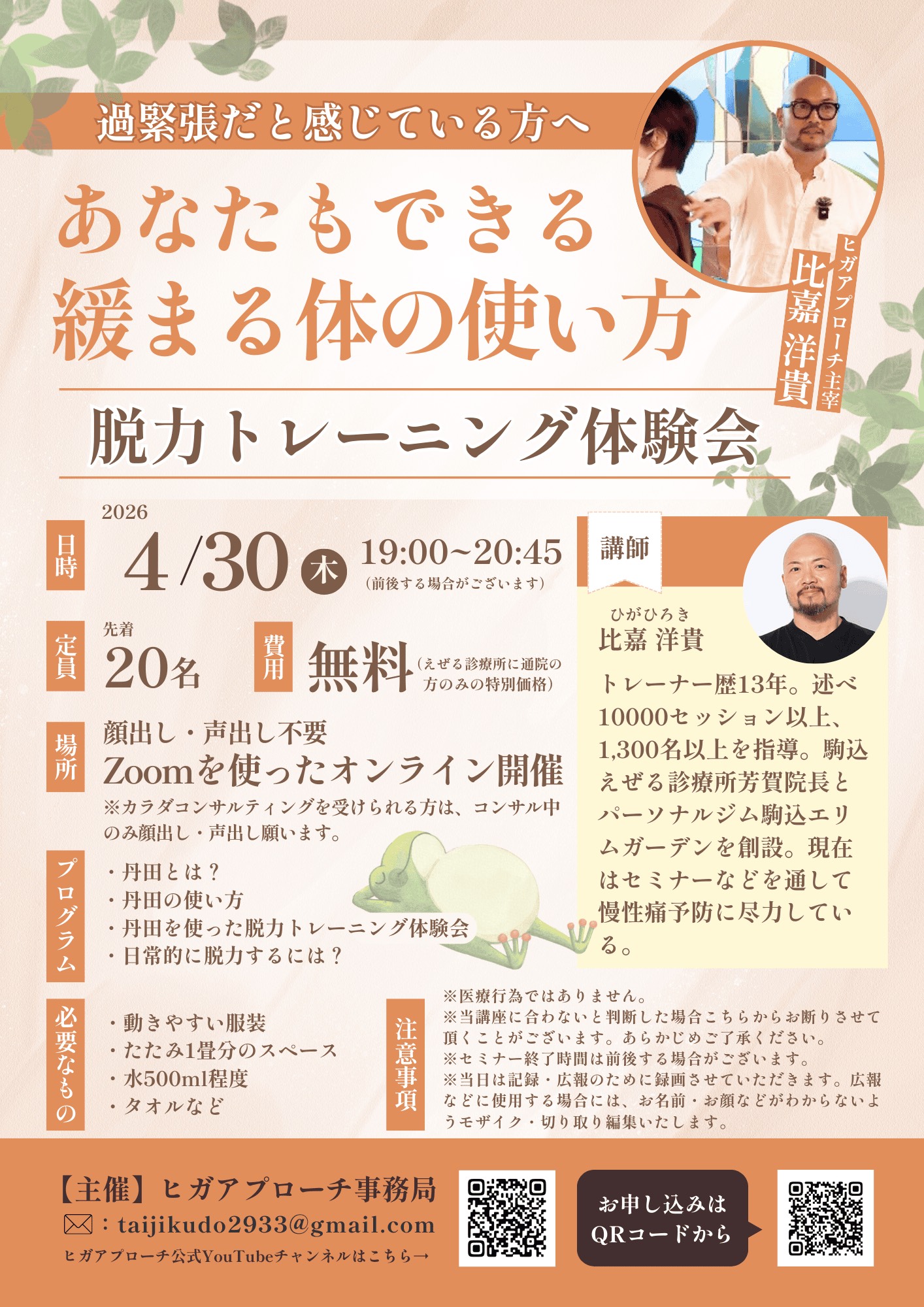 - 【4月30日】脱力トレーニング体験会「あなたもできる緩まる体の使い方」が開かれます(オンライン・患者様対象・事前申込制)。